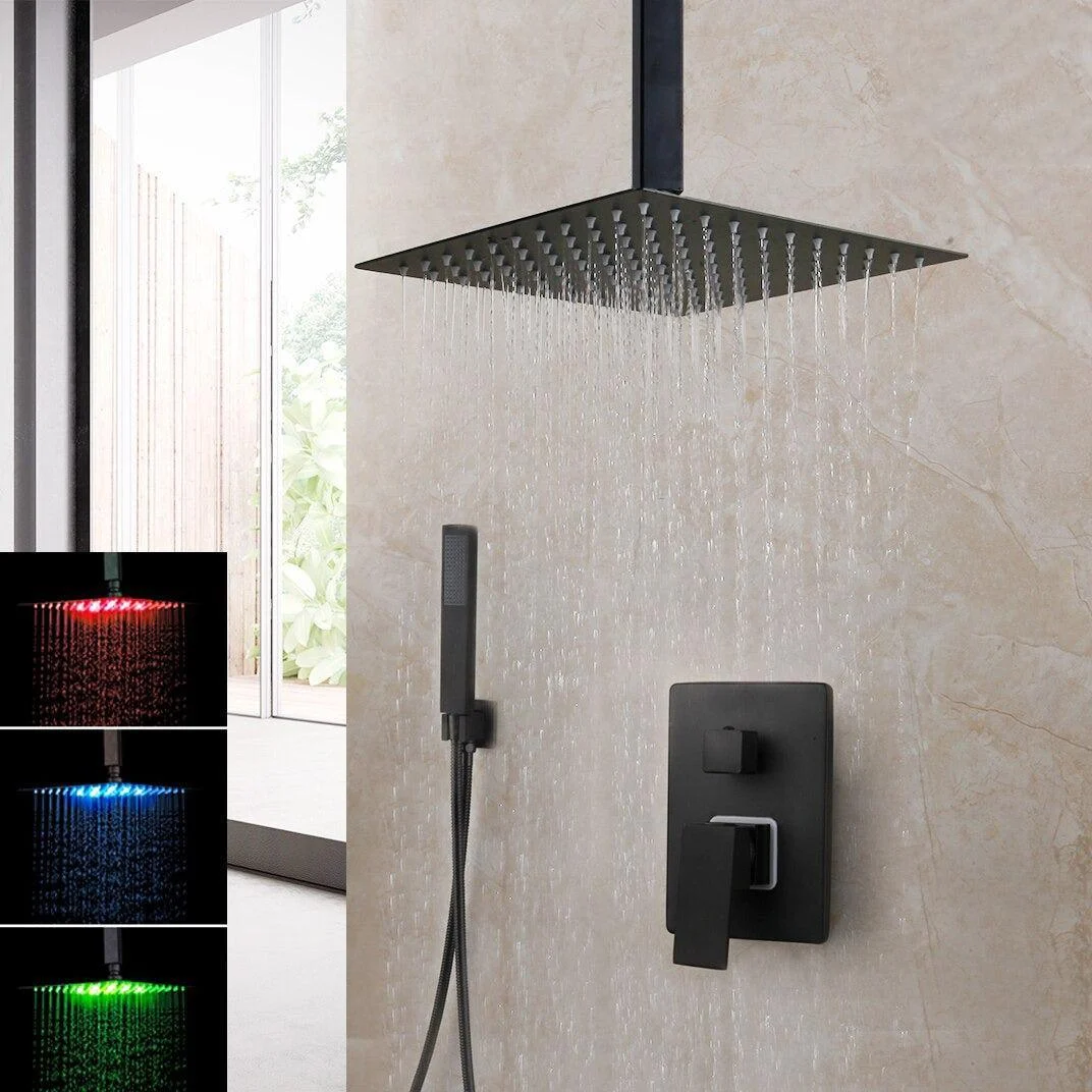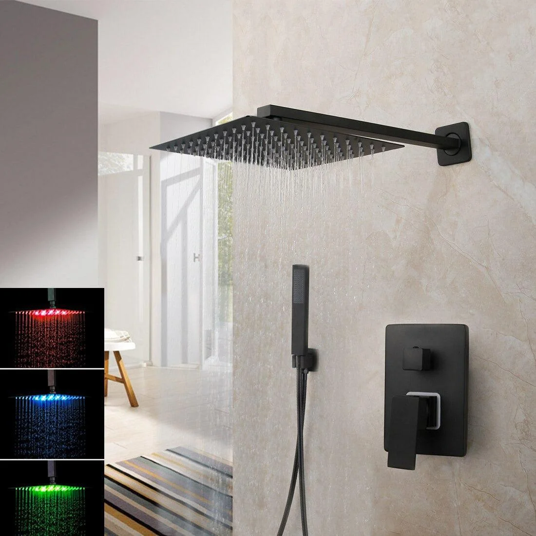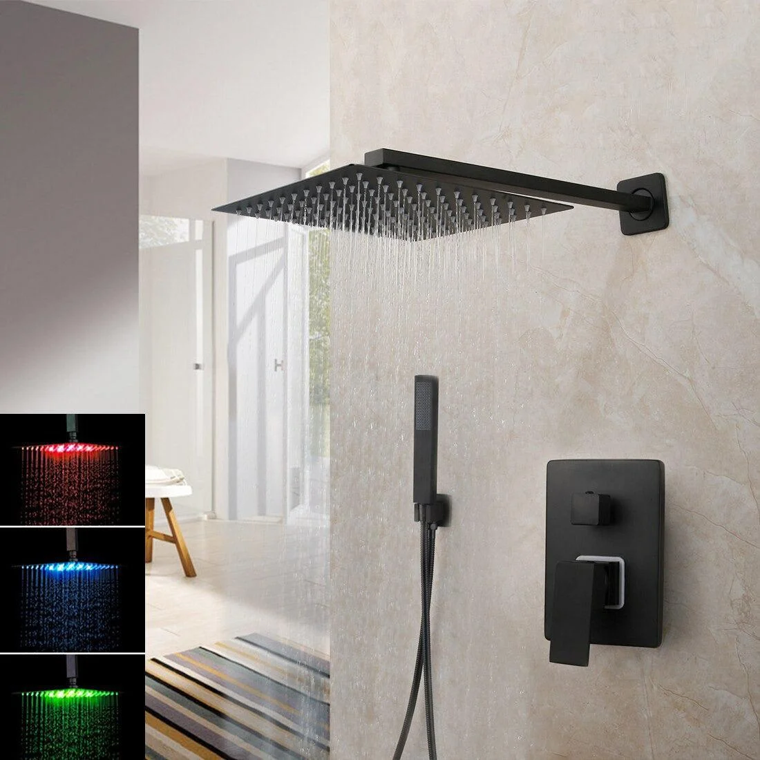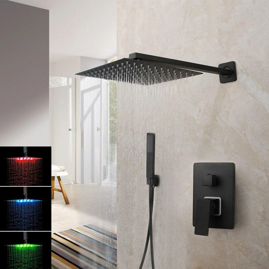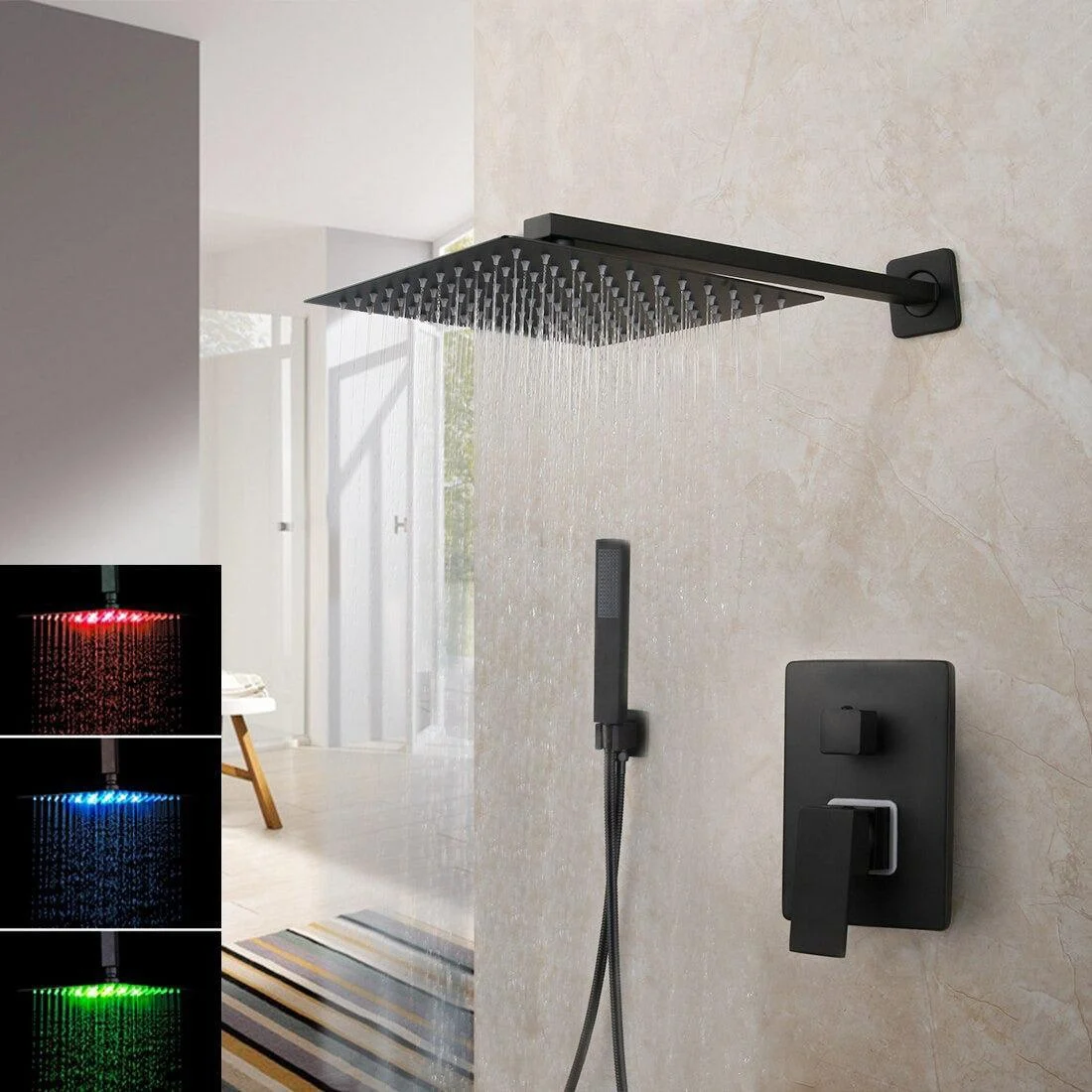 The sleek design features a stylish square rain shower head and a mixer valve that can be adjusted to either constant spray or powerful massage mode.