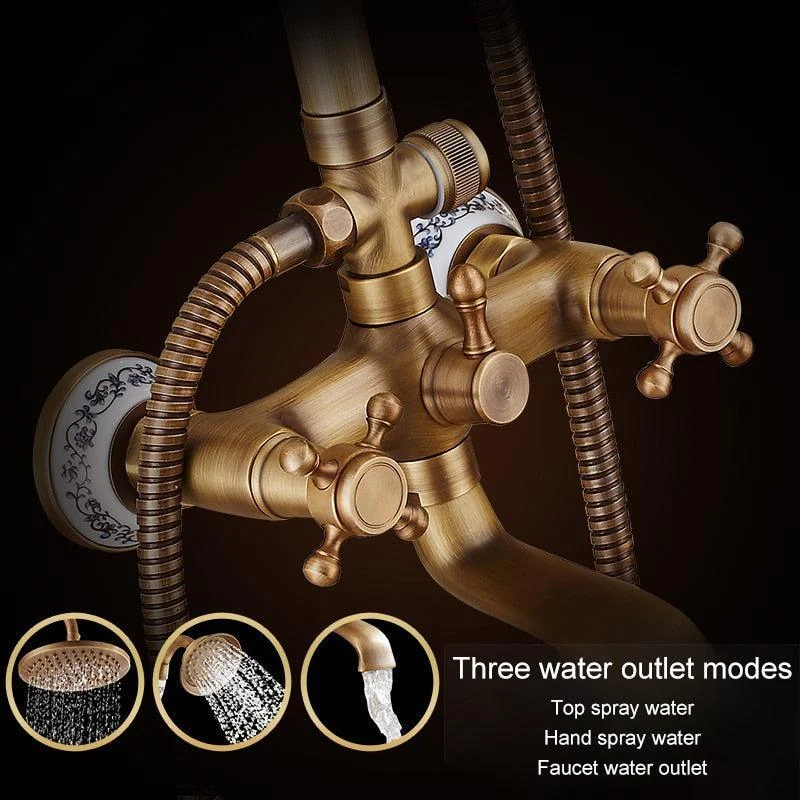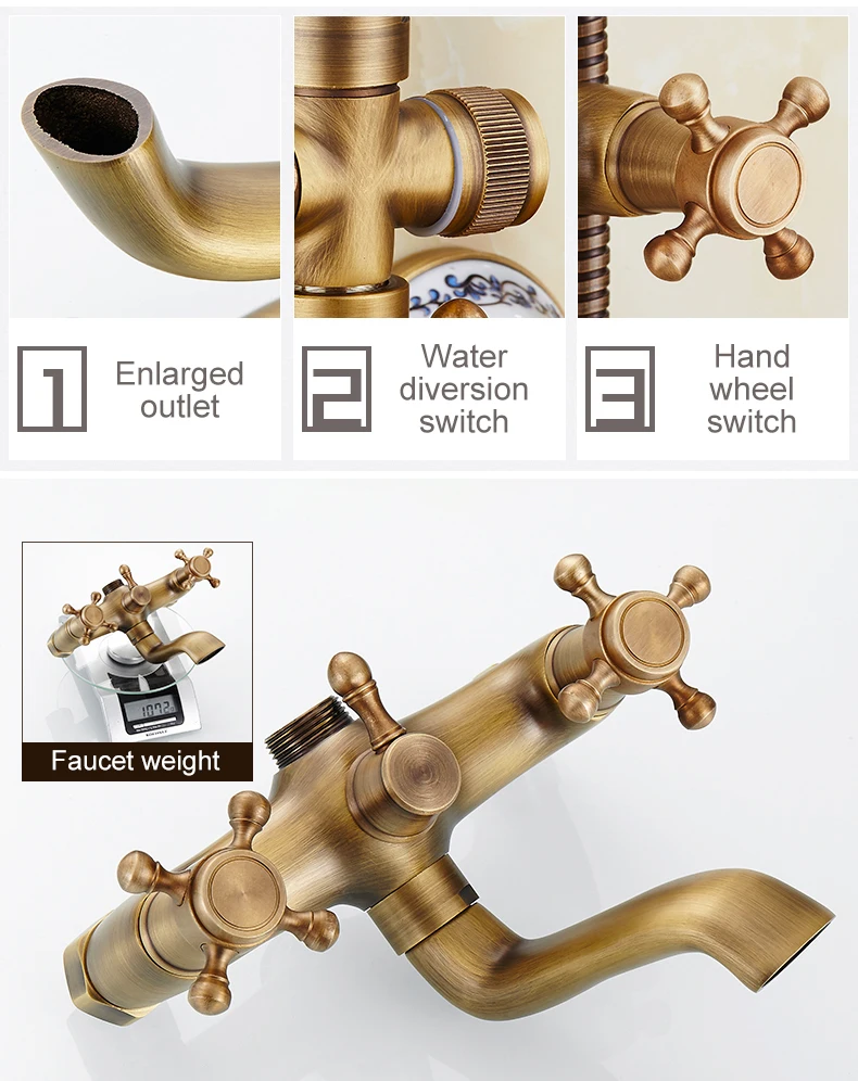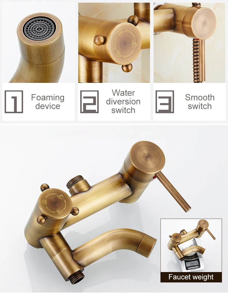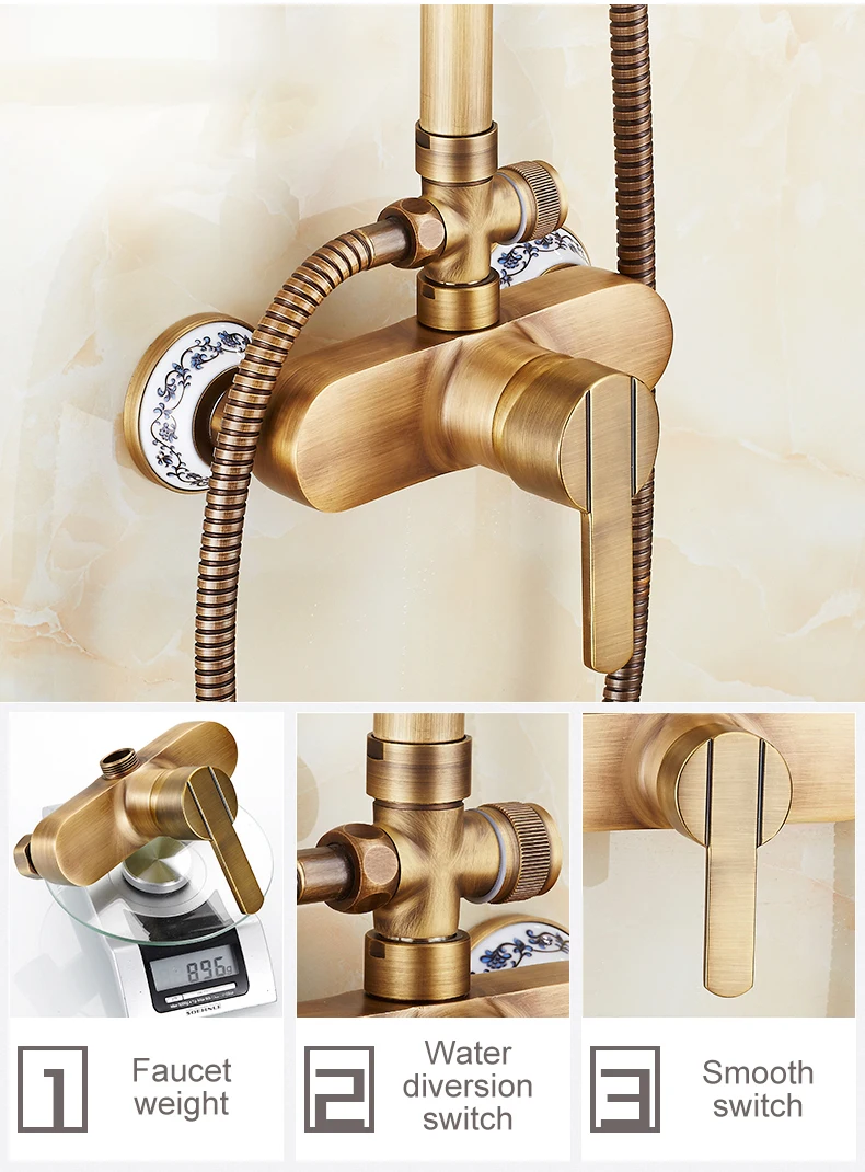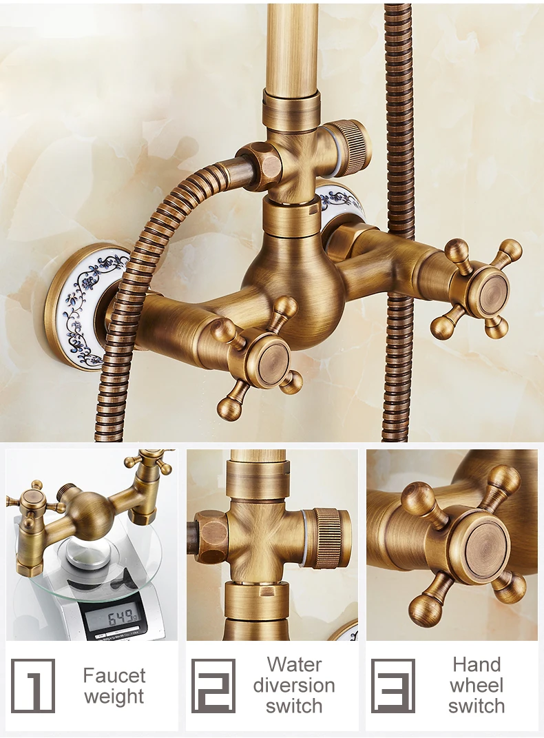 Other features include a hand brass shower mixer for the highest flow rate and water pressure, solid brass construction for durability, Chrome plated handles and premium ceramic disc valves, and an anti-scald spout.